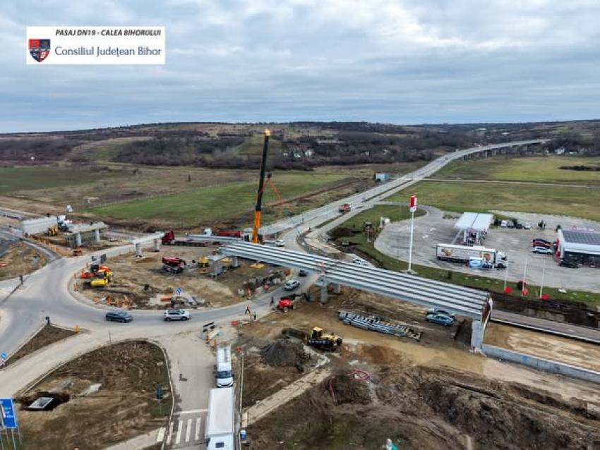 Săptămâna aceasta a început montarea grinzilor la pasajul suprateran care se construiește la ieșirea din Oradea spre Satu Mare, deasupra sensului giratoriu de la intersecția DN19 și Calea Bihorului. În total, vor fi montate 25 de grinzi.