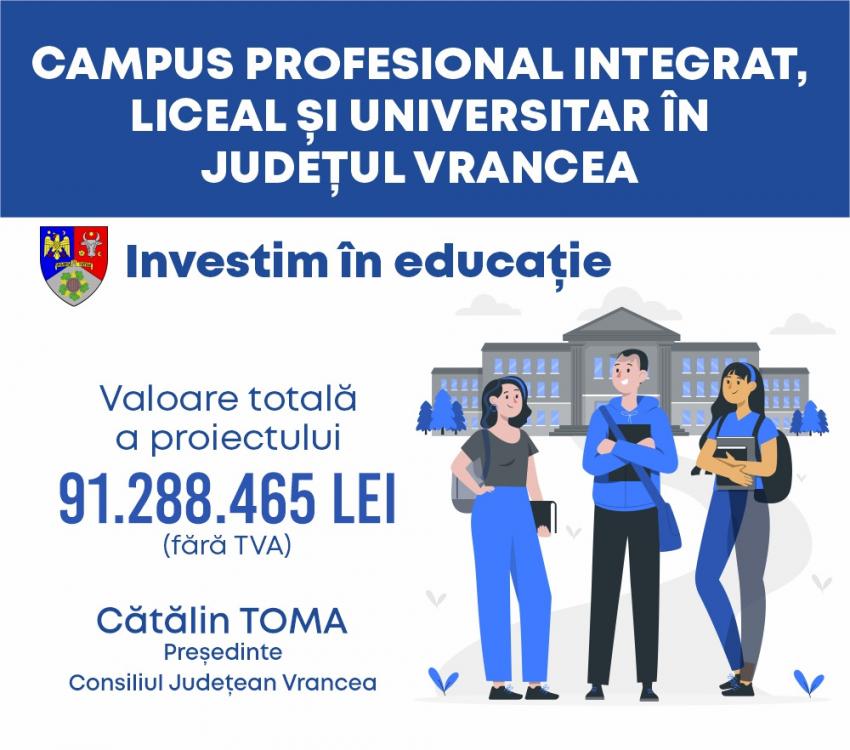 Consiliul Județean Vrancea a scos la licitație serviciile de proiectare și lucrările de construcție pentru un proiect major pentru învățământul din județ, Campusul profesional integrat, liceal și universitar care va fi realizat în Vrancea.