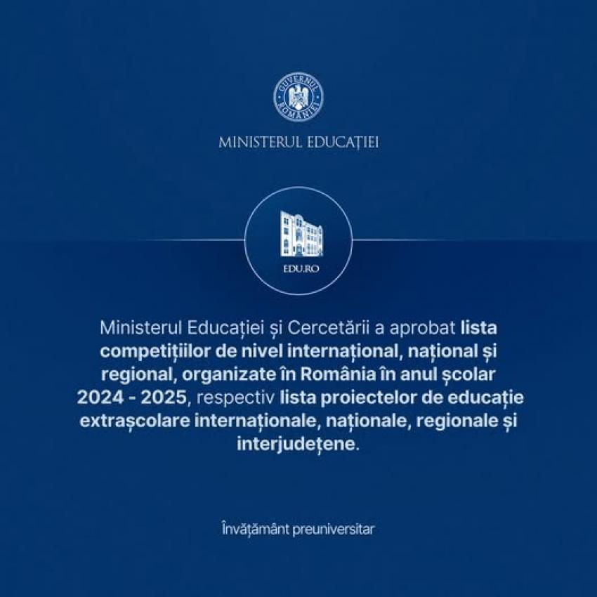 Ministerul Educației și Cercetării a emis ordinele prin care se aprobă listele competițiilor școlare și sportive ce se vor organiza și desfășura în România în anul școlar 2024 - 2025, la nivel internațional, național și regional, respectiv lista proiectelor de educație extrașcolară regionale, interjudețene, naționale, internaționale (cu și fără finanțare din partea ministerului).