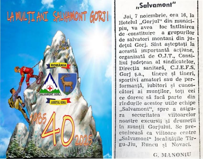Serviciul Salvamont al Consiliului Județean Gorj, la ceas aniversar! S-au împlinit 40 de ani de când, un anunț în gazeta locală invita alpiniștii, schiorii, speologii și toți iubitorii de munte să participe la constituirea primei structuri de salvare montană a județului Gorj. Inițial, sub coordonarea lui Ioan Dumitrescu, ofițer de vânători de munte, s-a constituit „Centrul Salvamont Gorj”, finanțat de către Consiliul Popular prin Direcția Sanitara Gorj, având o structură formată din două echipe de câte șapte salvatori montani și câteva rezerve. Începând cu anul 2016, Serviciul Public Județean Salvamont Gorj a obținut acreditarea privind desfășurarea de activități de prevenire a accidentelor montane și de salvare în munți și certificatele de atestare a capacității operative de intervenție pentru cele patru formației de salvare montană Gorj, Parâng, Vâlcan și Cerna