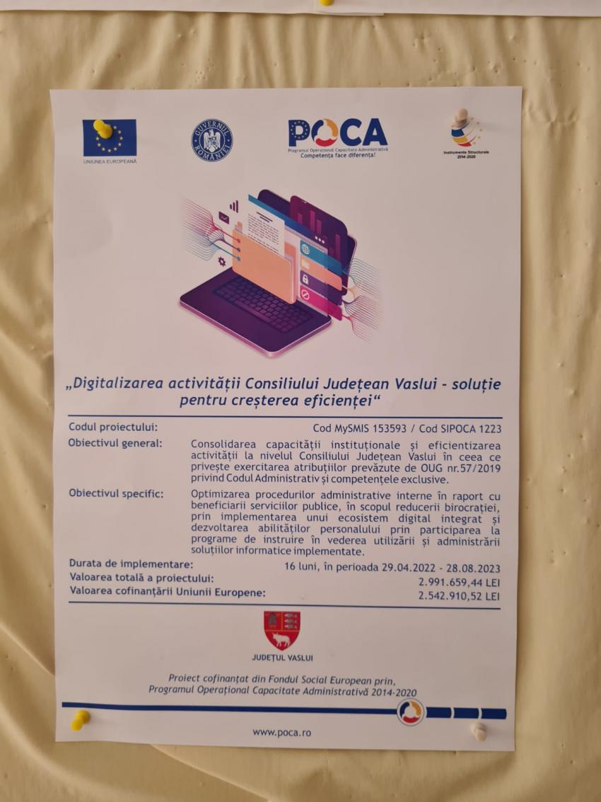 Consiliul Județean Vaslui, în calitate de beneficiar, a implementat cu succes proiectul „Digitalizarea activității Consiliului Județean Vaslui – soluție pentru creșterea eficienței”, finanțat prin POCA.
