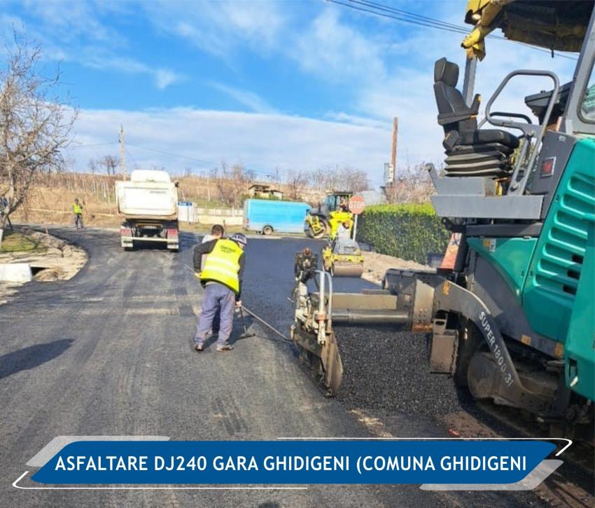 Se lucrează pe mai multe porțiuni, iar zilele acestea se toarnă primul strat de asfalt între Gara Ghidigeni și Gefu, după ce partea carosabilă a fost lărgită cu peste un metru, iar fundația a fost consolidată.