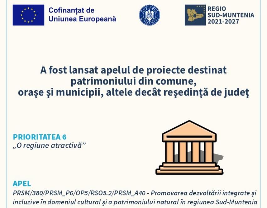 Apelul de proiecte aferent Ghidului solicitantului „Promovarea dezvoltării integrate și incluzive în domeniul cultural și a patrimoniului natural în regiunea Sud-Muntenia pentru comune, oraşe şi municipii, altele decât municipiile reşedinţă de judeţ”, Prioritatea 6 - O regiune atractivă, Obiectivul Specific RSO 5.2 - Promovarea dezvoltării locale integrate și incluzive în domeniul social, economic și al mediului, precum și a culturii, a patrimoniului natural, a turismului sustenabil, și a securității în alte zone decât cele urbane, Operațiunea B – destinată comunelor, oraşelor şi municipiilor, altele decât municipiile reşedinţă de judeţ.